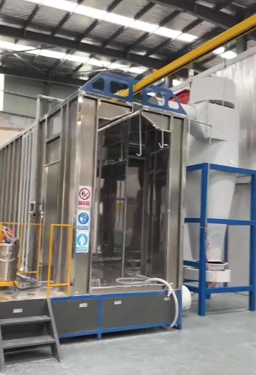 Автоматическая порошковая кабинка предназначена для автоматических линий, где в кабине есть конфириоризованная линия, переносящая детали. На стенде есть отверстия с каждой стороны для взаимности, а также может иметь художественные столбы, где художник может стоять со своим ручным оружием с ручным покрытием и исправить неокрашенные части (если они есть - это зависит от сложности геометрии) для лучшего отделки.